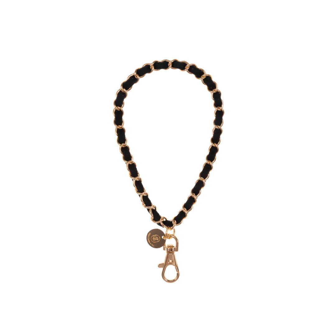 Phone Wristlet featuring Gold Plated Chain w/ 100% Black Suede Woven Throughout. Turn your phone into a wearable accessory that keeps you hands-free... think of it as a bracelet for your cell phone!
