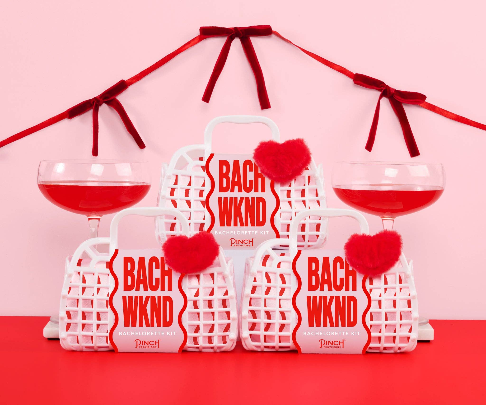 New for the I-Do Crew, it's the Bachelorette Kit by Pinch Provisions! Getting ready for a bachelorette party weekend has never been easier with this perfect, pre-packed swag bag for the bride-to-be and her babes. This adorable, petite white jelly tote—with a playful pink and red design and fuzzy heart bag charm—contains 8 party and post-party essentials: