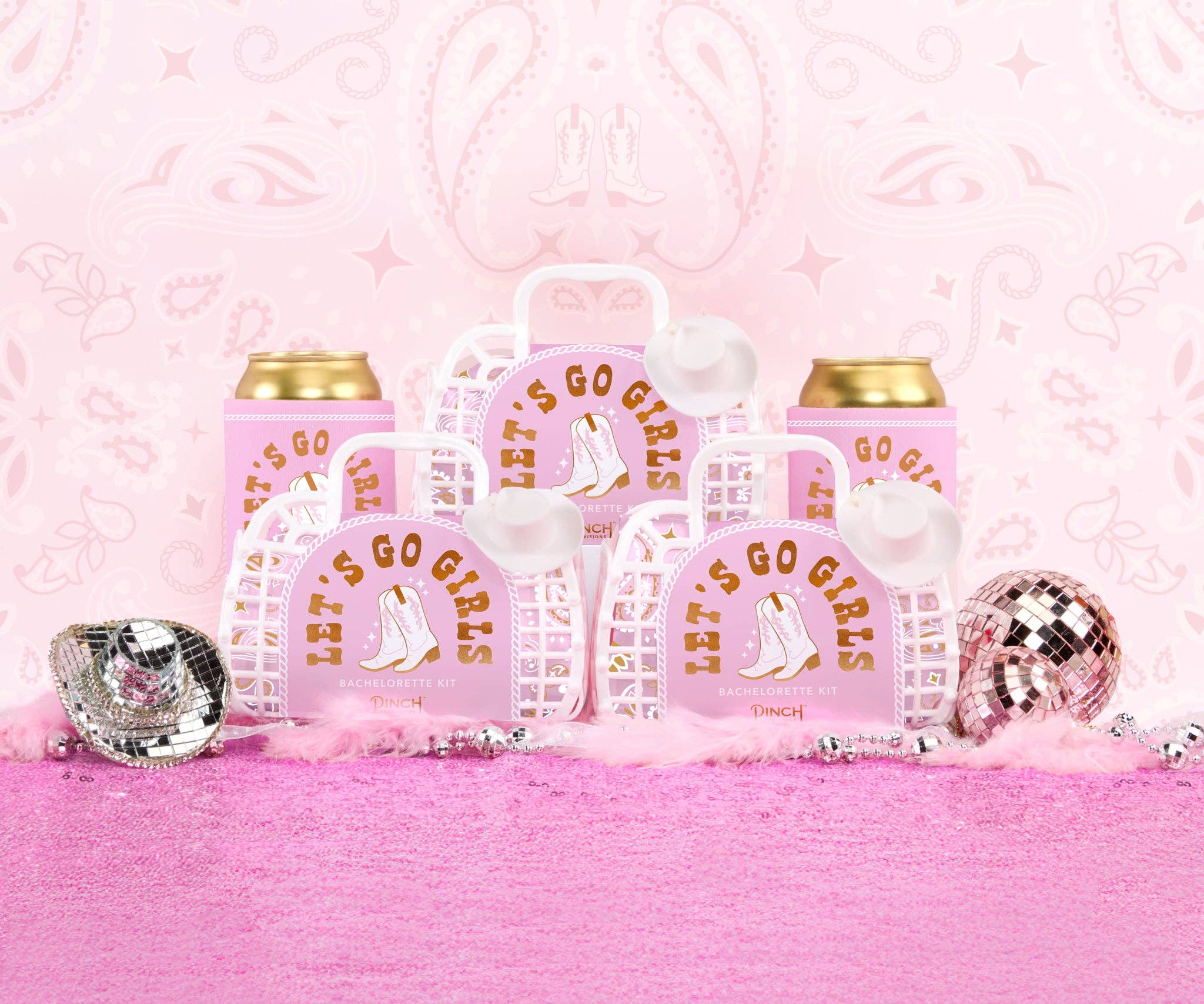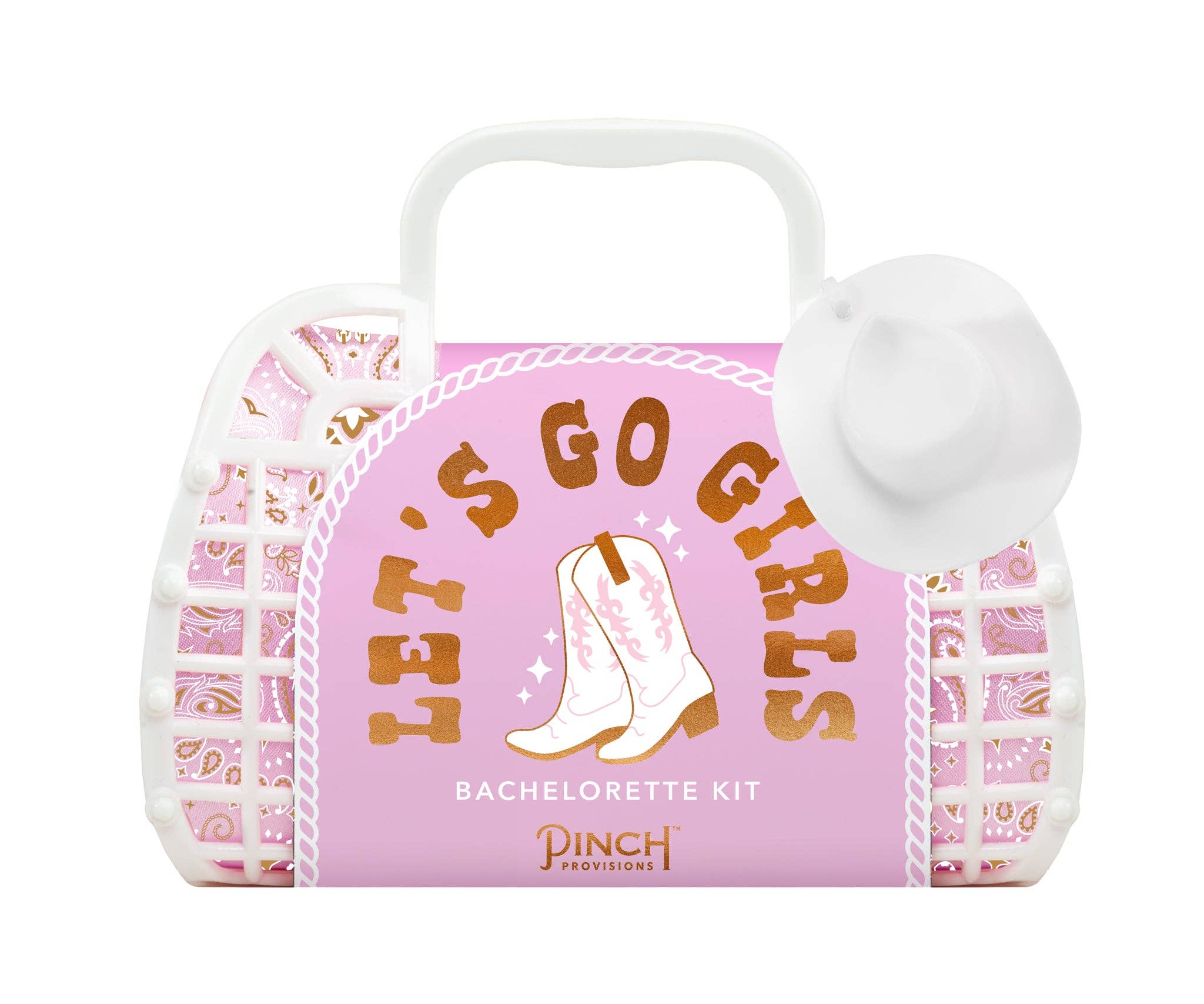New for the I-Do Crew, it's the Bachelorette Kit by Pinch Provisions! Getting ready for a bachelorette party weekend has never been easier with this perfect, pre-packed swag bag for the bride-to-be and her babes. This adorable, petite white jelly tote—with a pink cowgirl theme complete with hat bag charm—contains 8 party and post-party essentials: